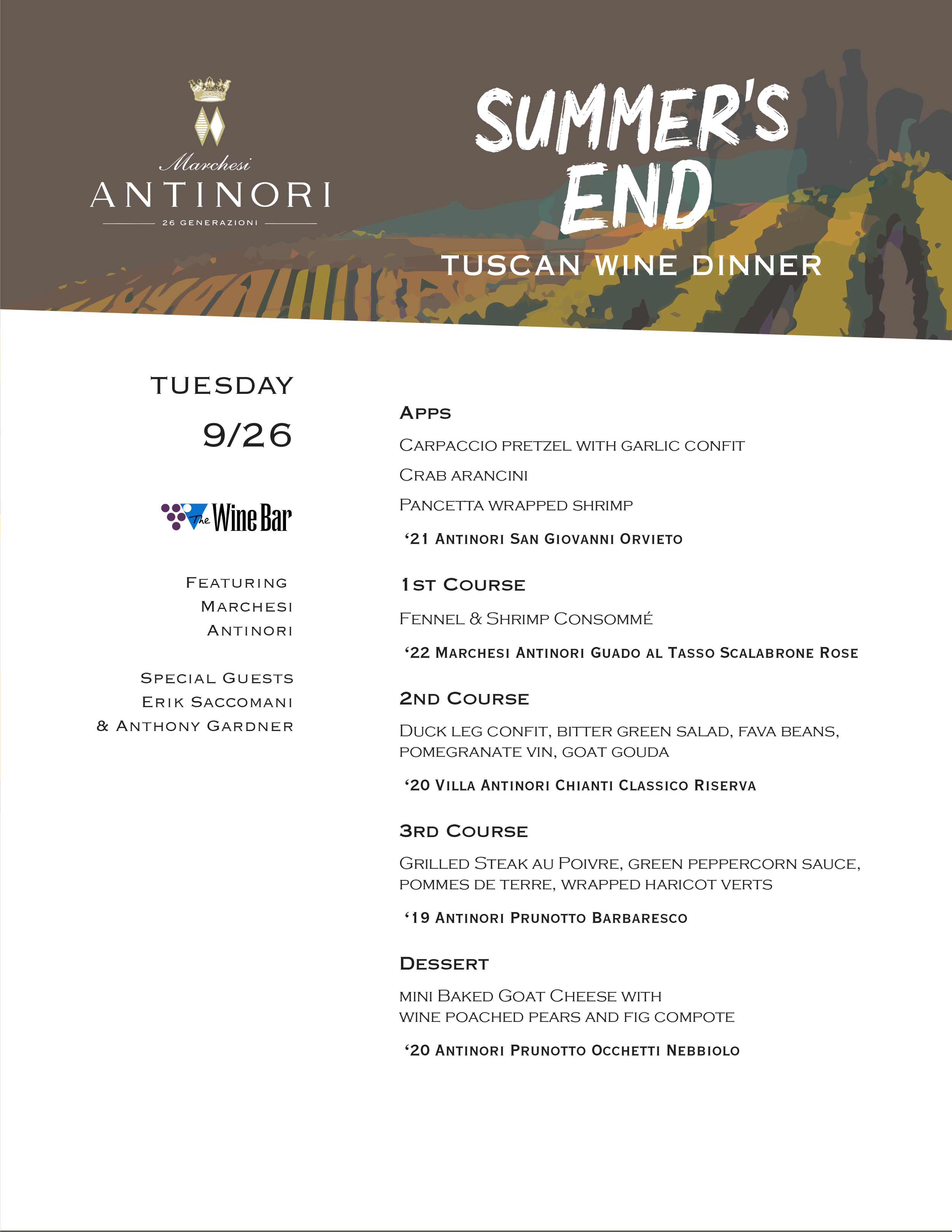 Enjoy 5 carefully selected wines from the expansive selection of award winning wines from Antinori, perfectly paired with reception hors d'oeuvres and 4 impeccable courses from The Wine Bar’s Executive Chef Max Morrison.