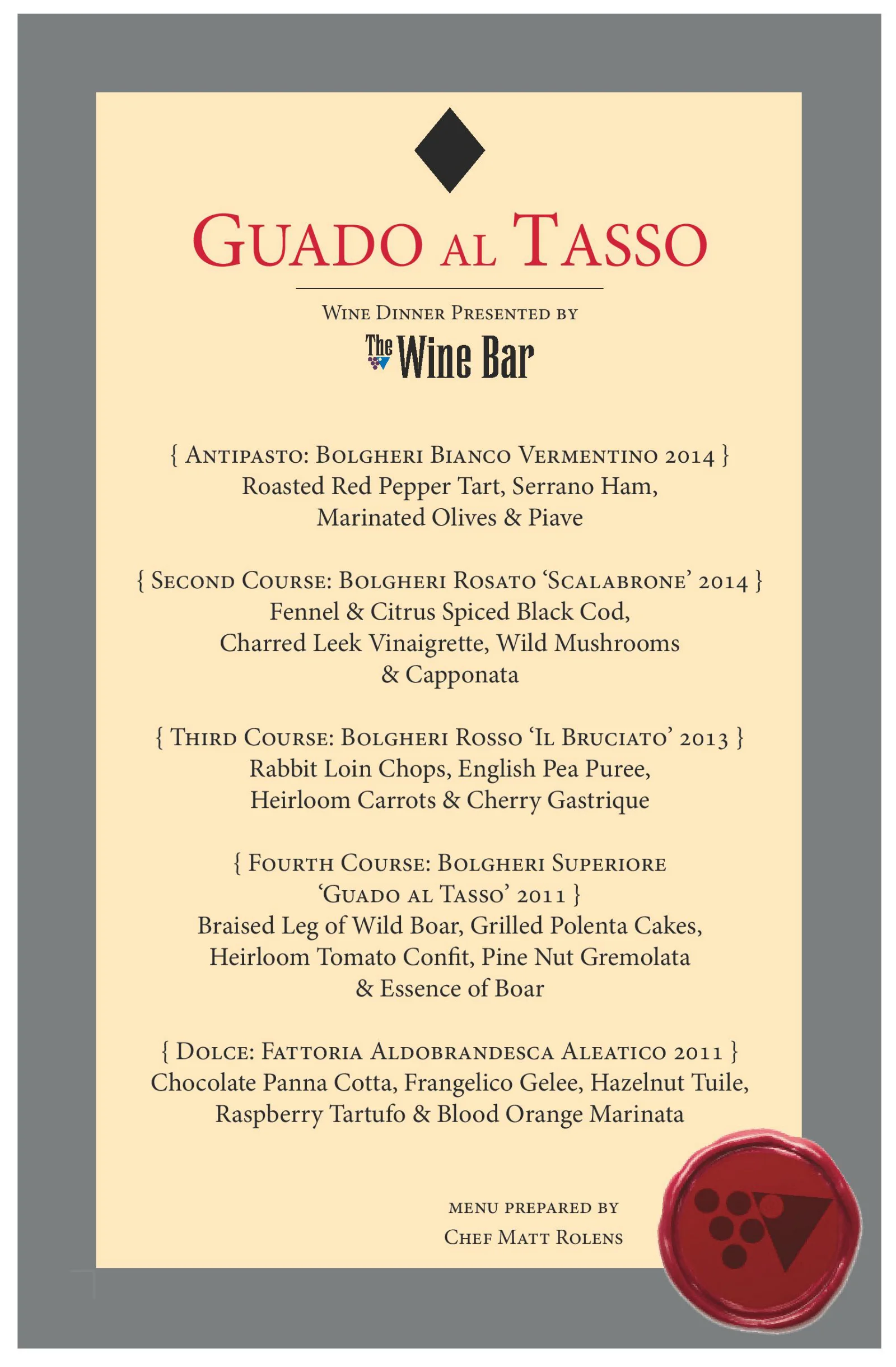 LIMITED SEATING AVAILABLE! Attendees of our previous wine dinners know to expect a sensory delight featuring a fantastic gourmet menu paired with the Tuscan wines from the Guado Al Tasso Estate.