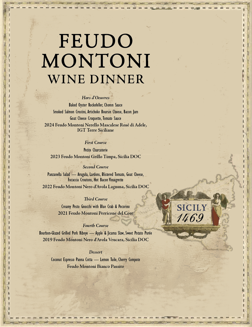 This special evening features six premium wines from Feudo Montoni, paired with chef-crafted dishes inspired by the estate’s deep agricultural heritage and the rugged beauty of central Sicily.