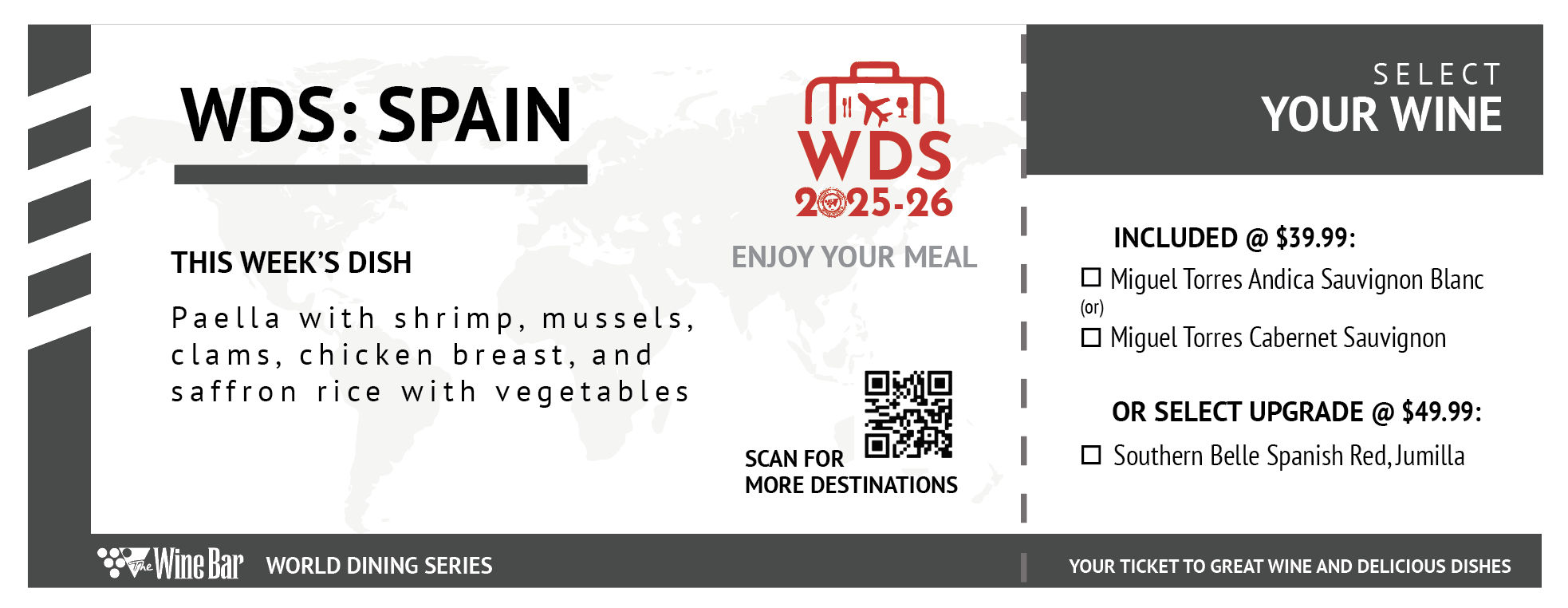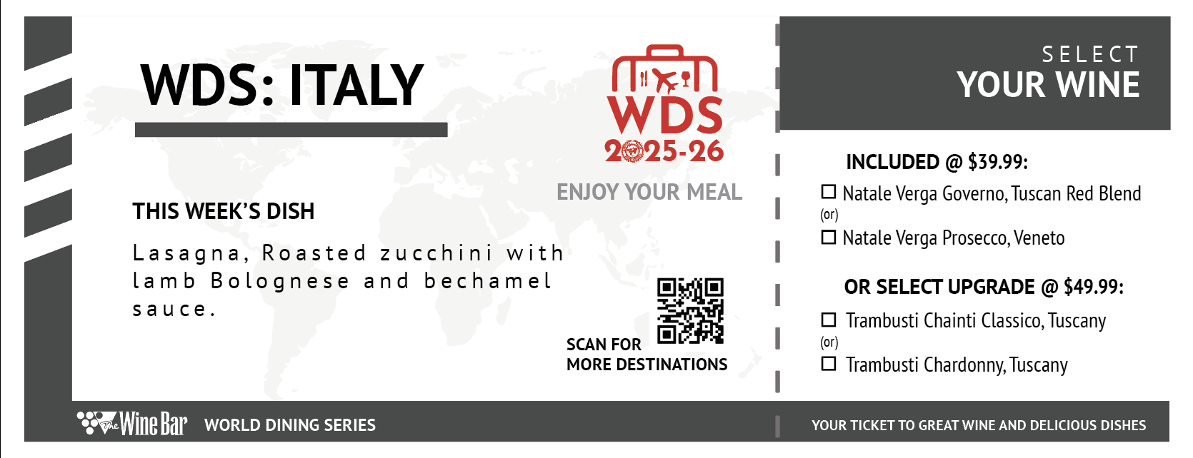 The Wine Bar’s Famous World Dining Series is back with regional dishes paired with a bottle of wine for just $39.99. This is a limited time special, so pack your bags and let’s go World Dining!