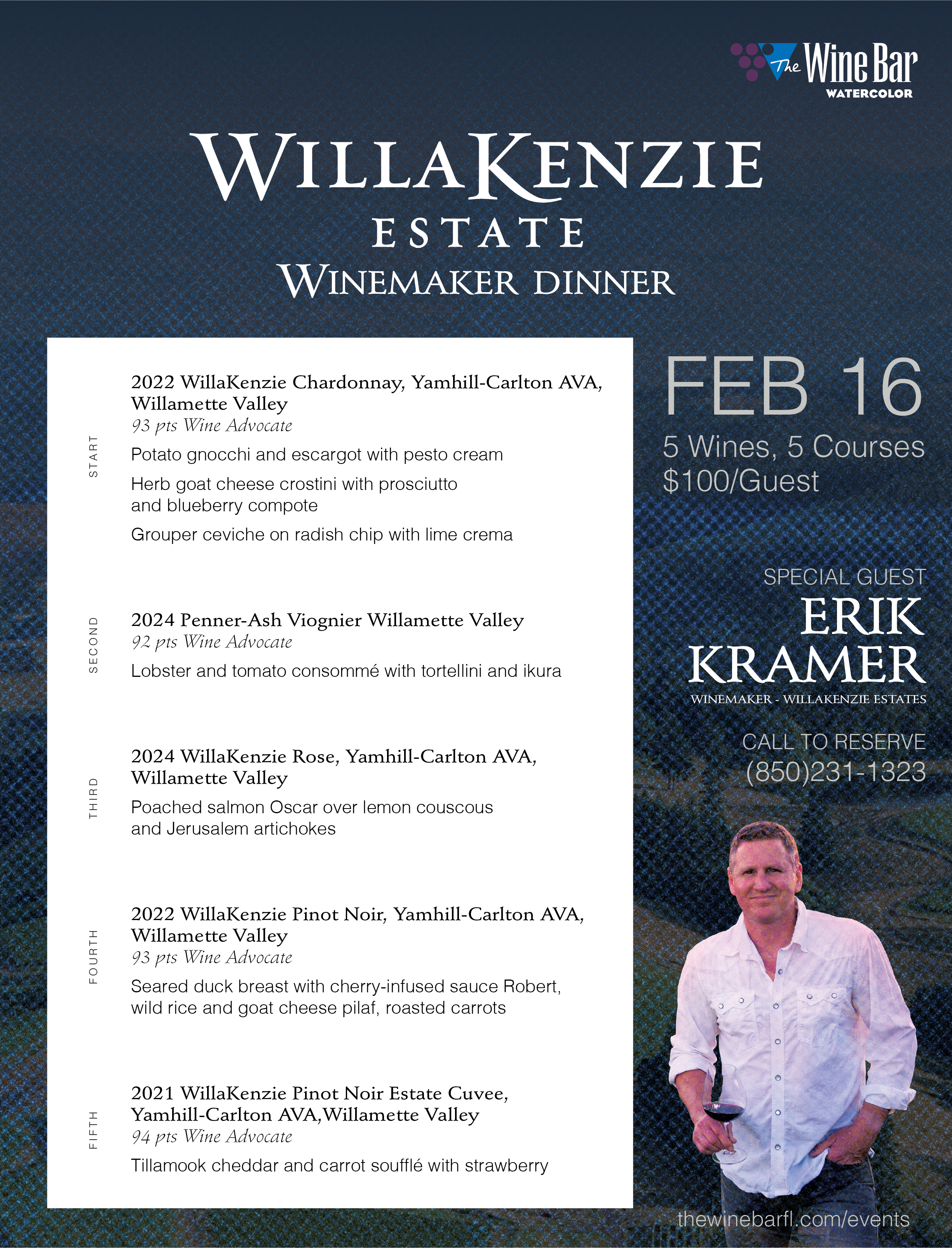 Join us for a rare and unforgettable Winemaker Dinner featuring Erik Kramer, Winemaker for the world-renowned WillaKenzie Estate, one of the most historic and distinctive properties in Oregon’s Willamette Valley.